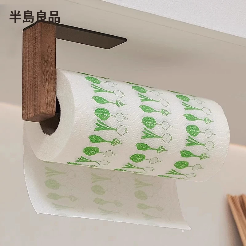 くるみ材のキッチンペーパーホルダー - 取り付け不要で便利!キャビネット用のペーパー掛け、ロールペーパーや布巾、ラップも掛けられるおしゃれなデザイン。整理整頓を簡単に!