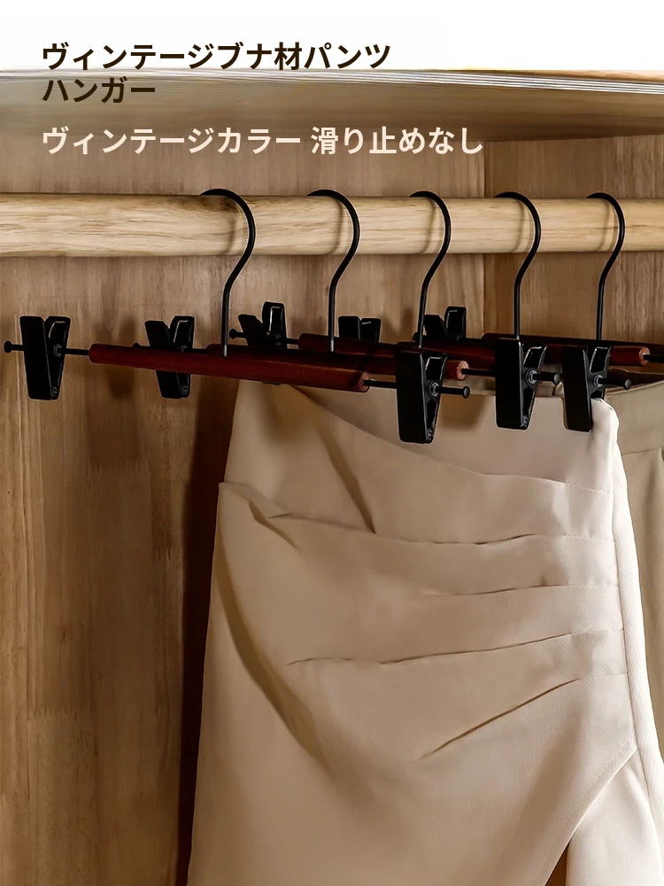 木製パンツハンガー - 滑り止め付きでズボンやスカート、靴下も収納可能!クリップ付きでしっかりホールド、家での洗濯物干しに最適!痕が残らない設計で、衣類を大切に保護します!