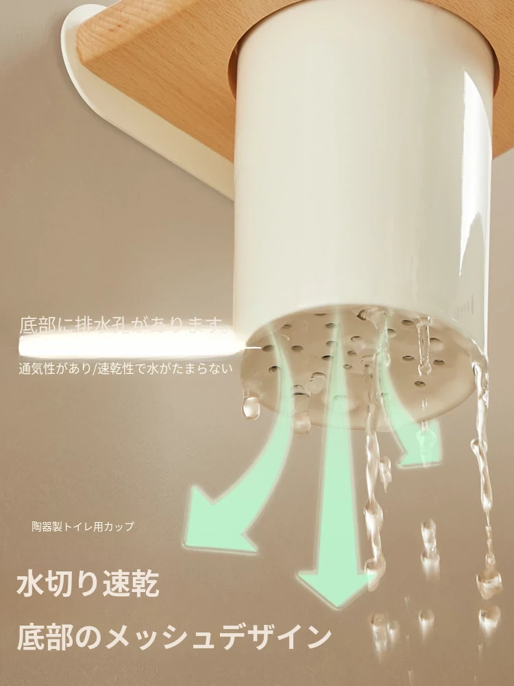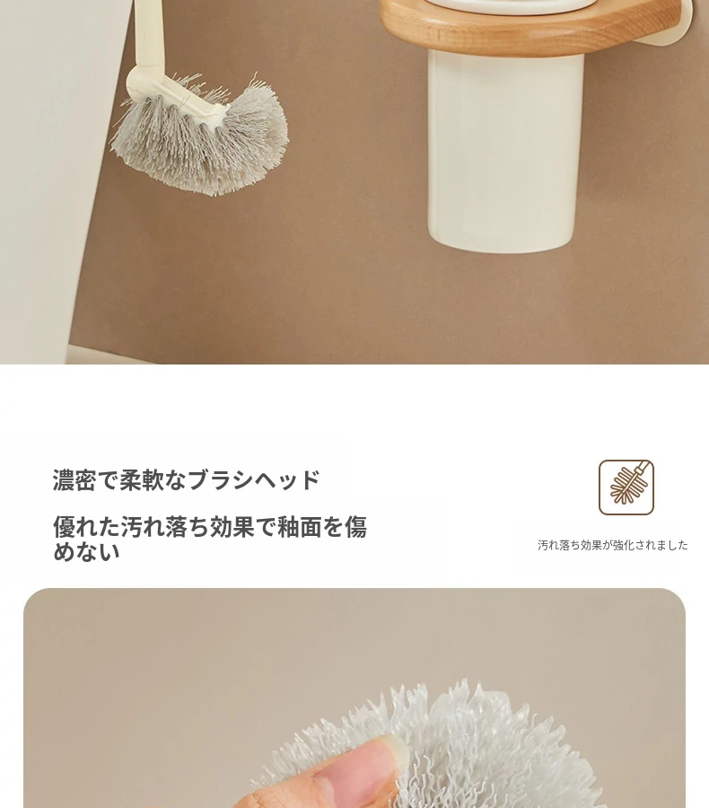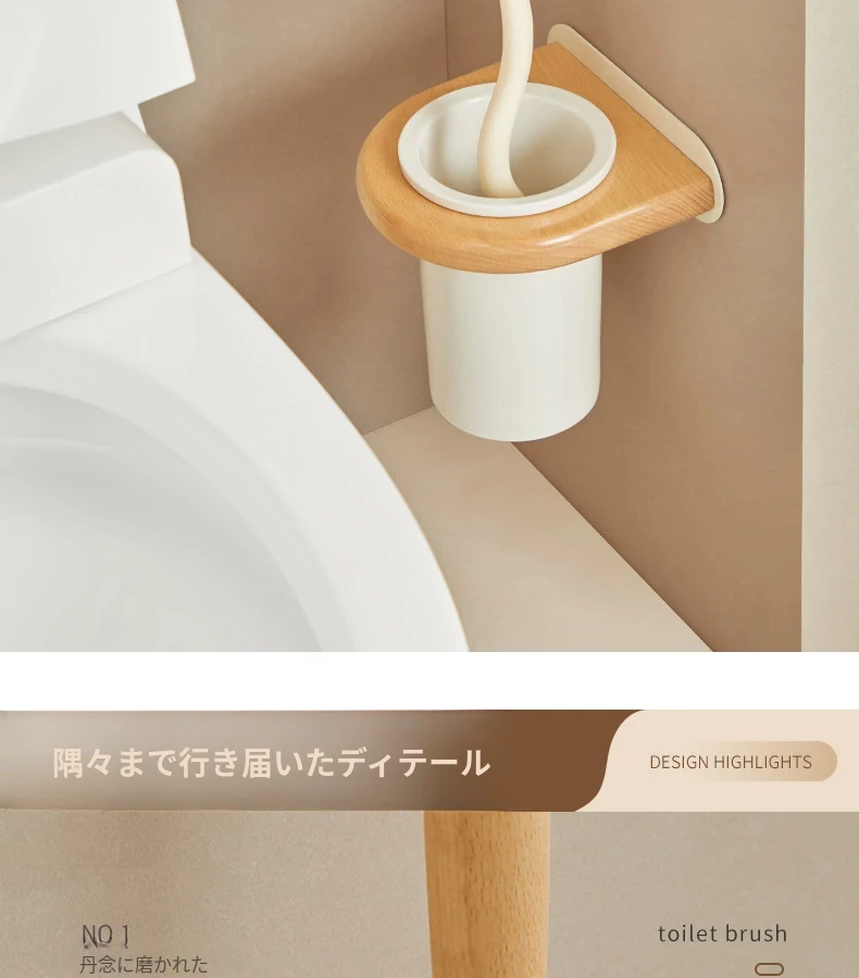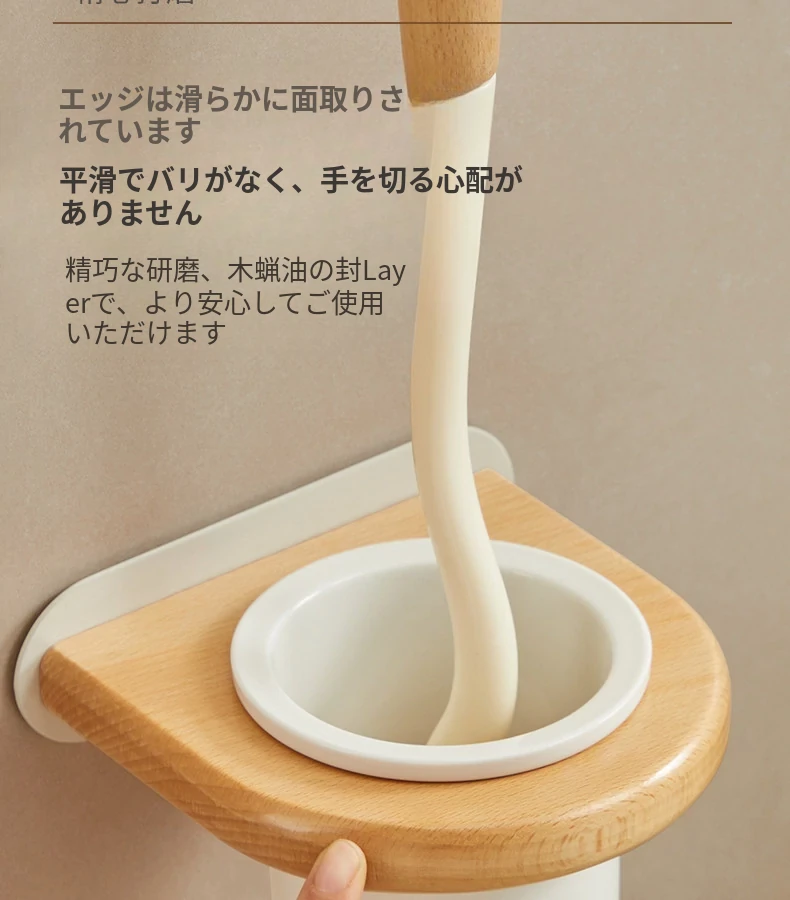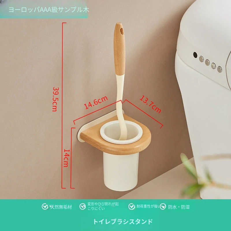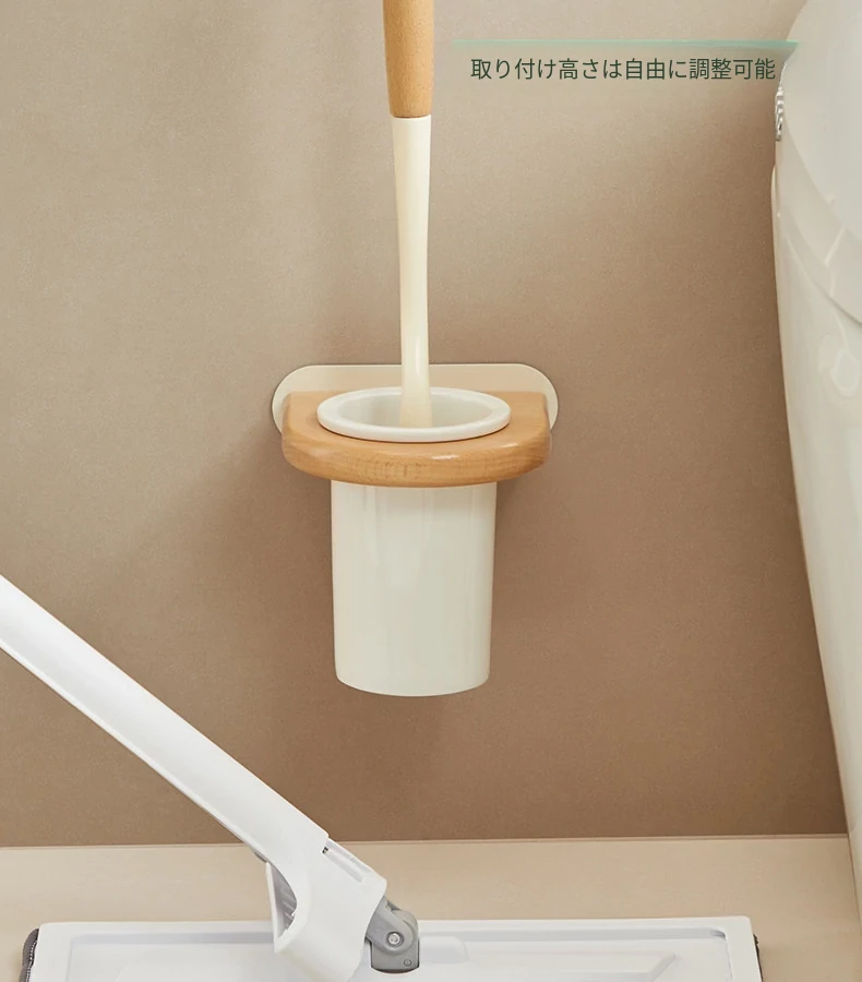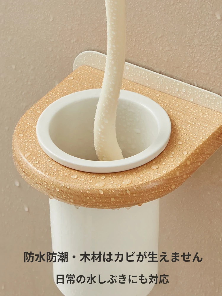 無孔取り付け可能!天然木製のトイレブラシスタンドセット - 壁掛け式の本格的な陶器カップとクリーニングブラシのコンビネーションで、清潔感あふれるバスルームを演出!
