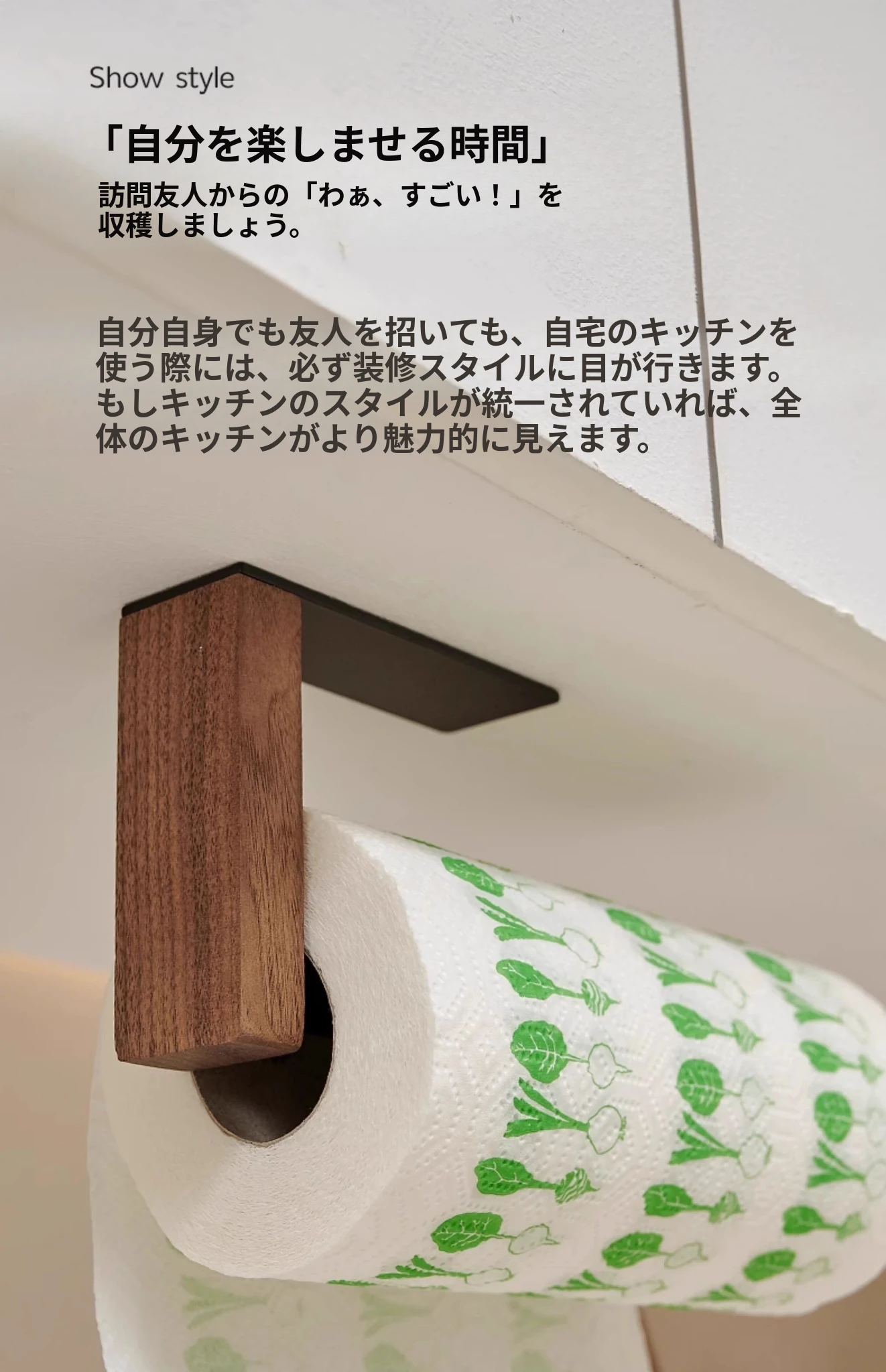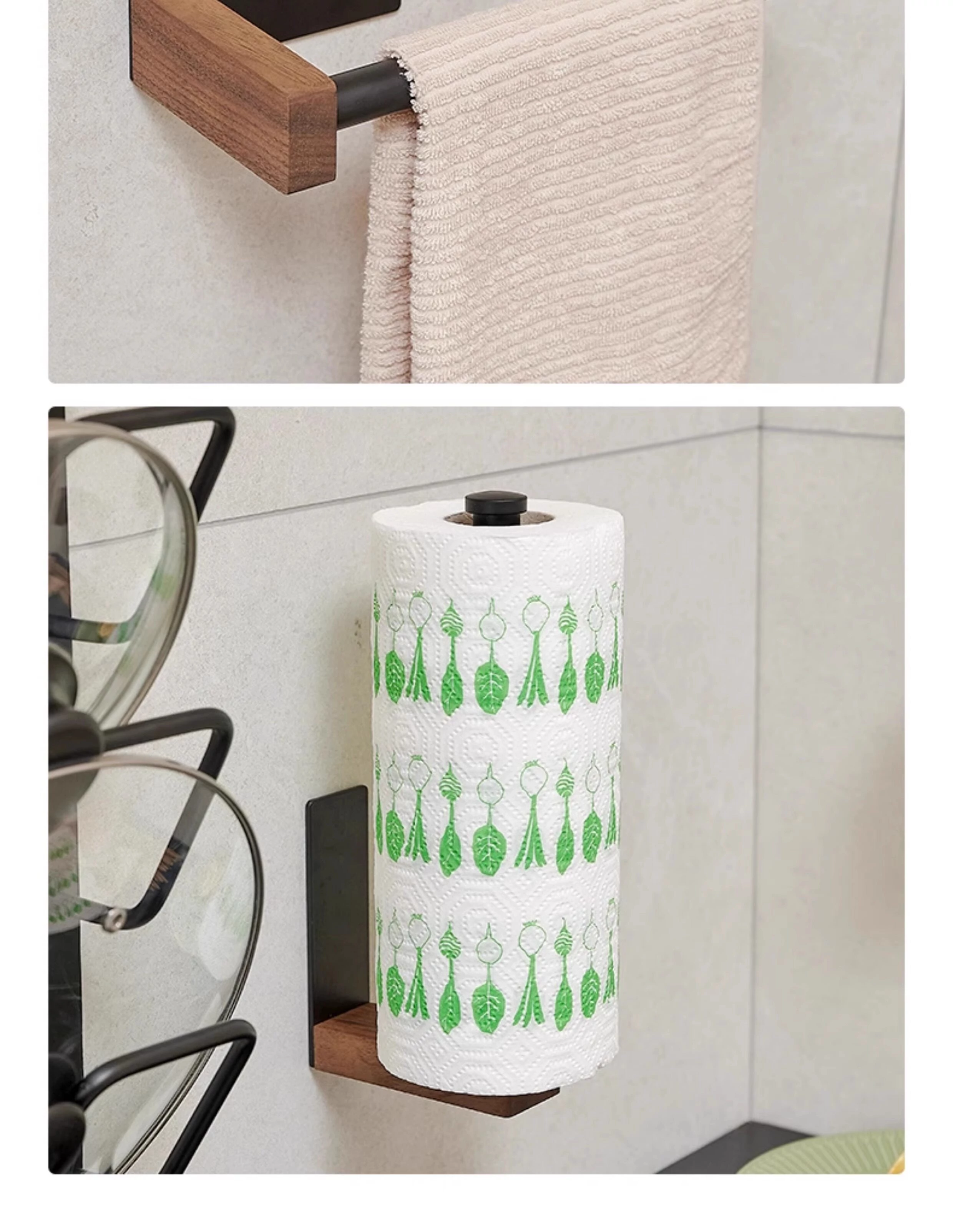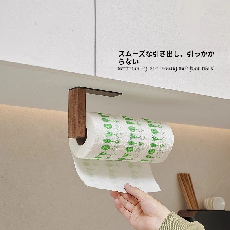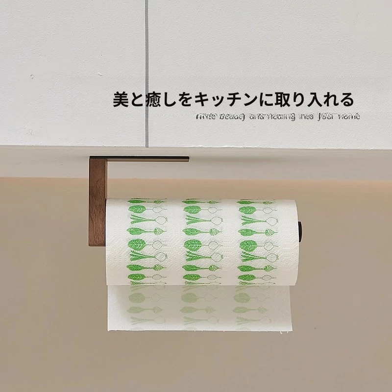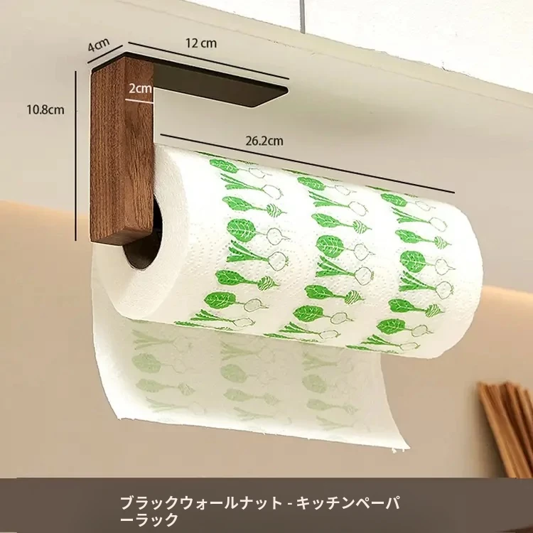 くるみ材のキッチンペーパーホルダー - 取り付け不要で便利!キャビネット用のペーパー掛け、ロールペーパーや布巾、ラップも掛けられるおしゃれなデザイン。整理整頓を簡単に!